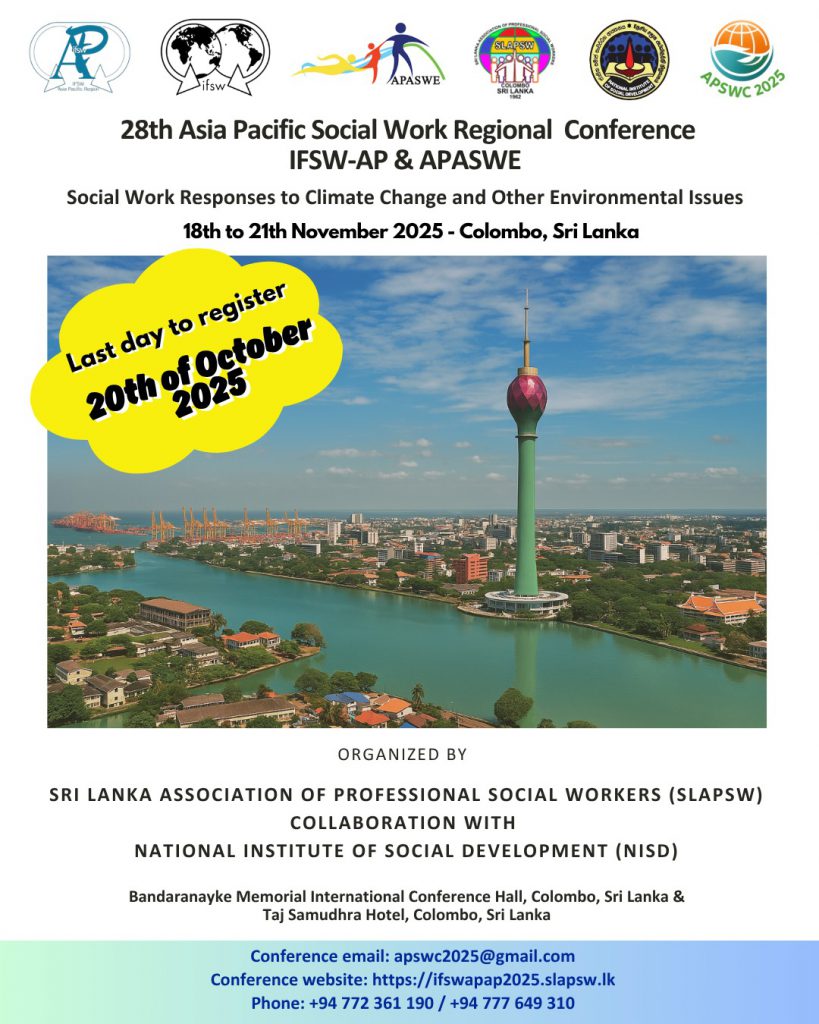 本年11月18日(火)から21日(金)まで、スリランカ・コロンボにて、国際ソーシャルワーカー連盟アジア太平洋(IFSW-AP)・アジア太平洋ソーシャルワーク教育連盟(APASWE)主催による「第28回アジア太平洋ソーシャルワーク会議(APSWC2025)」が開催されます。